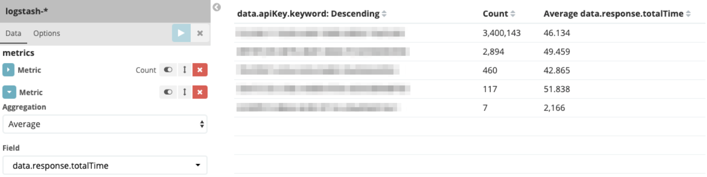 - We first want to see the average time, so in the “metrics” section choose “Average” in Aggregation and “data.response.totalTime” in Field.