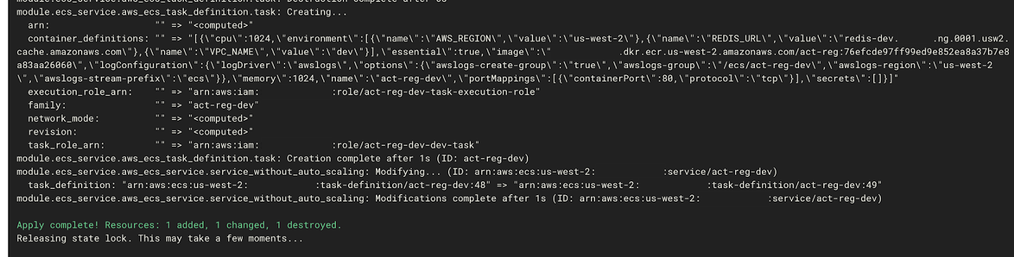 - The eighth and last step in the pipeline builds the docker container, pushes it to Amazon ECR, and finally deploys it on the ECS cluster. The following is the output of the final step of the build using Terraform to deploy the new docker image: