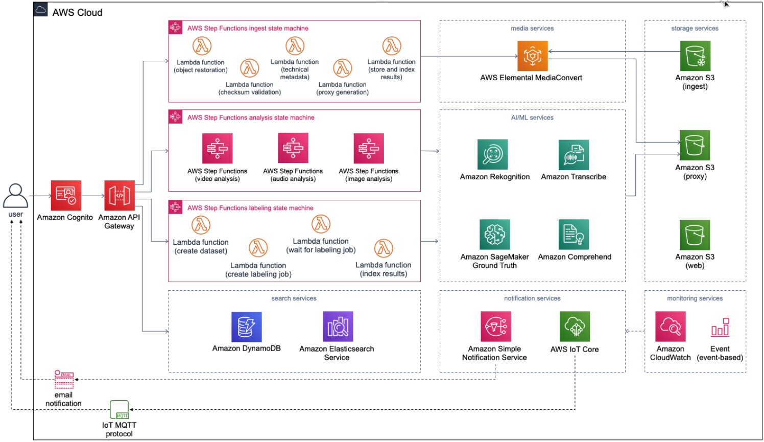 The S3 ingest bucket has an Amazon S3 lifecycle policy that automates the migration of uploaded videos and images to Amazon S3 Glacier for archiving.The ingest workflow leverages AWS StepFunctions and AWS Lambda to orchestrate the ingest workflow and trigger AWS Elemental MediaConvert to create standardized proxy files and thumbnails of the uploaded videos and images for analysis. Proxy files are stored in an S3 proxy bucket, and media information is stored in Amazon DynamoDB. When video processing is completed, Amazon Simple Notification Service (Amazon SNS) sends notifications to subscribers.